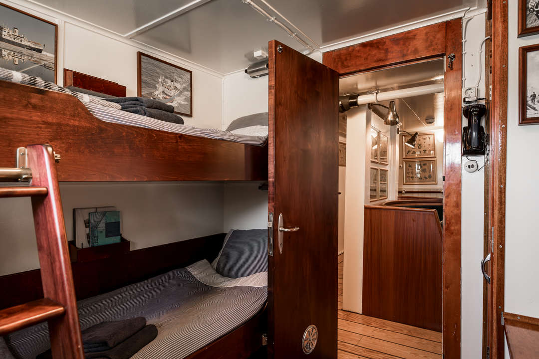 With space for just 12 guests across 6 twin cabins, the Stockholm offers one of the most intimate Arctic cruising experiences available. Originally built in 1953 and fully refitted in 1998, this historic Swedish vessel blends classic maritime charm with modern comfort. Each cabin features private facilities, bunk beds, and portholes, creating a warm, restful retreat after a day of adventure. The ship's wooden decks and brass details give it a unique, nostalgic atmosphere.