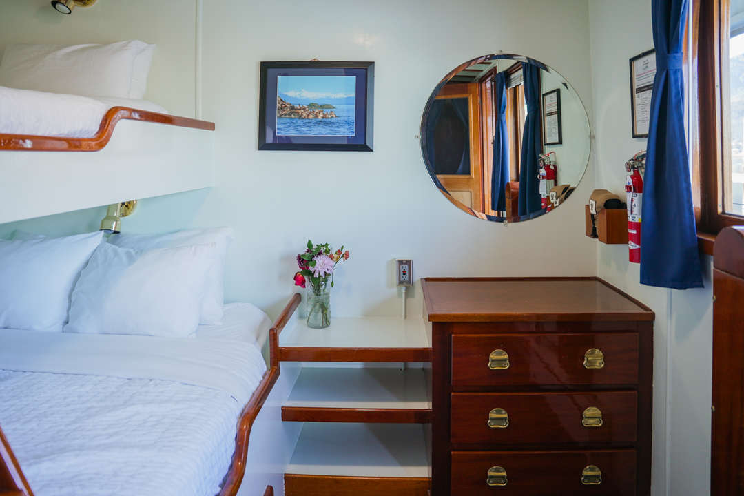 The M/V Liseron delivers an intimate small-ship experience, accommodating just 20 guests across 10 staterooms. Each cabin features a queen bed with an upper twin bunk, a private en-suite bathroom with a shower, individual temperature controls, storage, and large picture-frame windows that open to the fresh Alaskan air. Thoughtful touches like blackout curtains, hairdryers, and direct deck access ensure comfort after each day’s adventure, blending classic maritime charm with practical modern amenities.