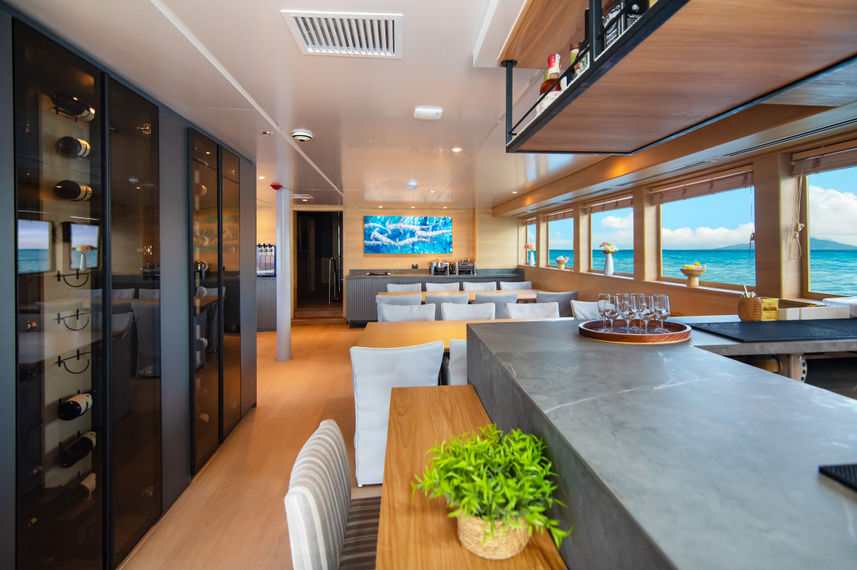 Die Gäste können sich in den Gemeinschaftsbereichen entspannen, sorgfältig zusammengestellte Gerichte aus regionalen Zutaten genießen und eine handverlesene Weinkarte probieren, die jedes Gourmetmenü perfekt ergänzt. Jedes Detail, von der Einrichtung bis zum Essen, wurde gewählt, um das Erlebnis an Bord auf ein neues Niveau maritimer Luxus zu heben.