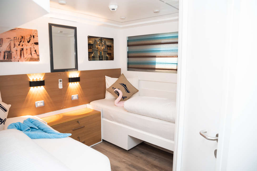Guests can unwind in the indoor dining area, socialize in the bar lounge, or soak up panoramic Red Sea views from the sun deck, shaded chill-out zones, and solarium. A dedicated dive deck supports underwater activities, while the indoor lounge features a TV/DVD system and sound system for evening entertainment. Full-board gourmet meals are freshly prepared by the onboard chef, and additional recreational offerings may include snorkeling sessions and evening yoga.