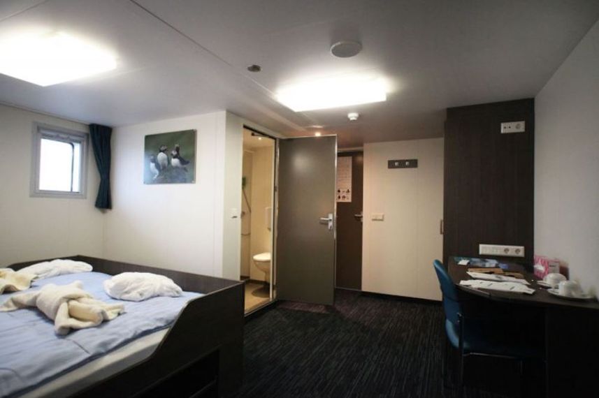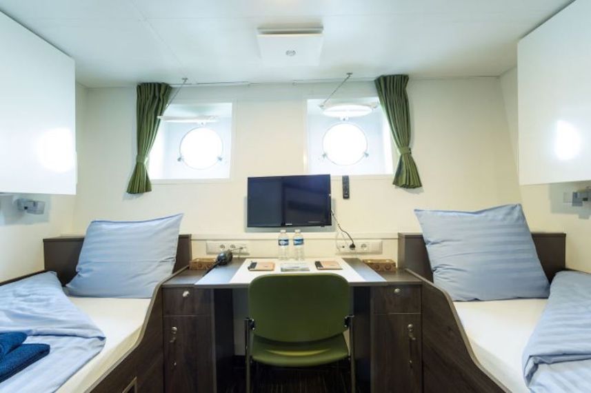 Topside, the 91m Ortelius accommodates 108 guests across several decks. There are 53 cabins on board, and options range from Quadruple share to Superior. All cabins have private toilet/shower facilities, a desk, a chair, a TV, a telephone, a hairdryer, and ample storage space. The Deluxe and Superior cabins also have a sofa, refrigerator, and tea & coffee-making facilities. Offering all the comforts of a standard hotel, the social areas include a spacious dining room, lounge, bar, and lecture room, as well as a deck with viewing space for wildlife spotting.