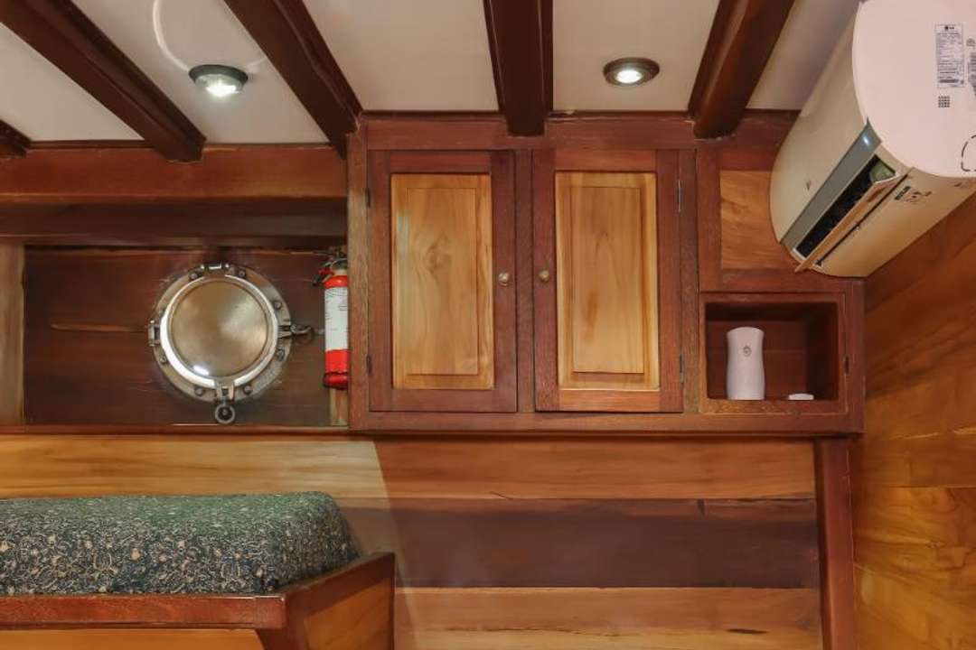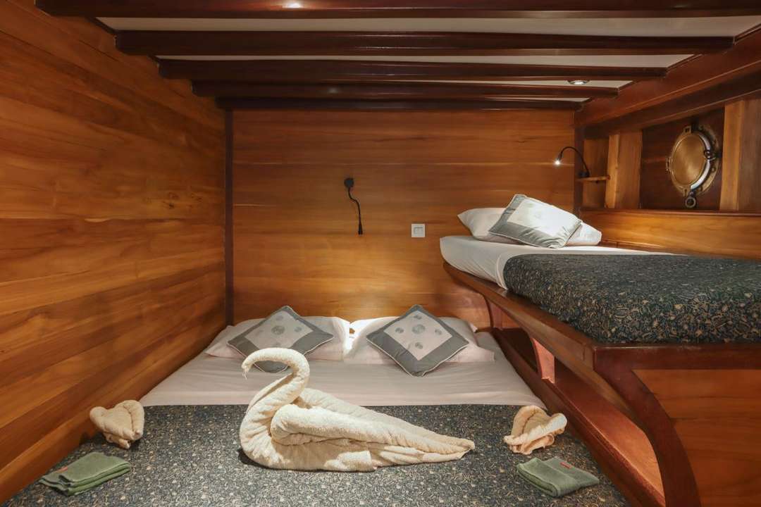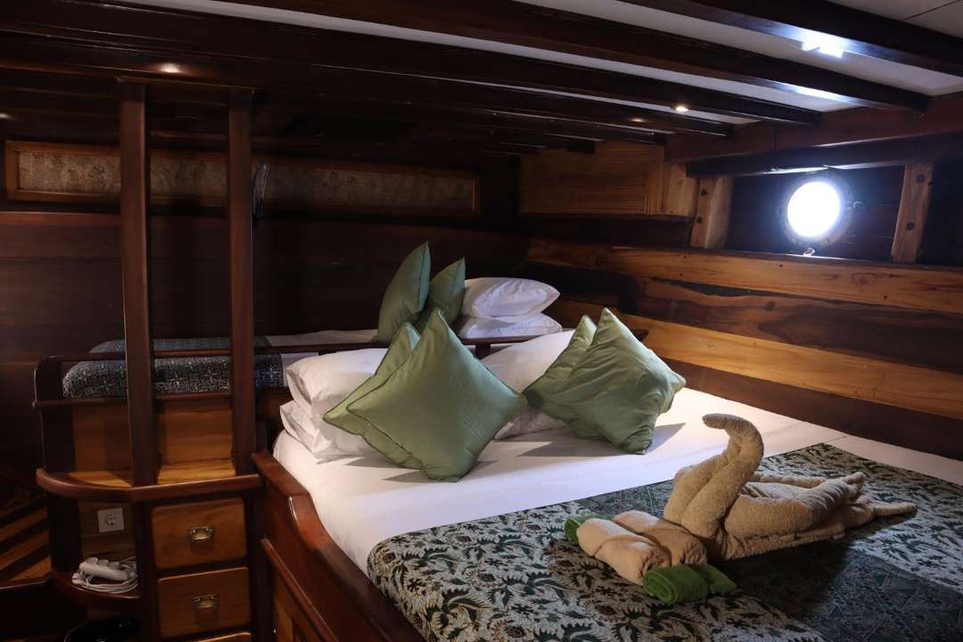 Gli ospiti possono rilassarsi sul ponte panoramico ombreggiato con sedute imbottite e pouf, prendere il sole sui lettini del ponte o riunirsi nel salone interno per cenare e trascorrere il tempo libero. Una zona pranzo all'aperto ombreggiata crea lo sfondo perfetto per i pasti all'aperto. La cucina fonde i sapori indonesiani con la raffinatezza europea, completata da colazioni tropicali fresche, caffè espresso, vini selezionati, cocktail e snack disponibili tutto il giorno. Le strutture ricreative includono kayak, stand-up paddleboard, attrezzatura per lo snorkeling, una piccola biblioteca di bordo con libri di identificazione di pesci e uccelli e connettività Starlink opzionale.