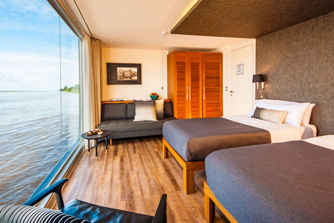 Aria Amazon is a river cruise ship designed to host just 32 guests in 16 river-facing suites, spread across 3 decks and supported by a 26-member crew. Each suite features floor-to-ceiling panoramic windows, premium bedding, elegant hardwood interiors, and ensuite bathrooms, creating a comfortable sanctuary deep in the Peruvian Amazon. Built with sustainability in mind, the vessel features fuel-efficient, low-emission engines and an onboard water-treatment plant to minimize environmental impact.