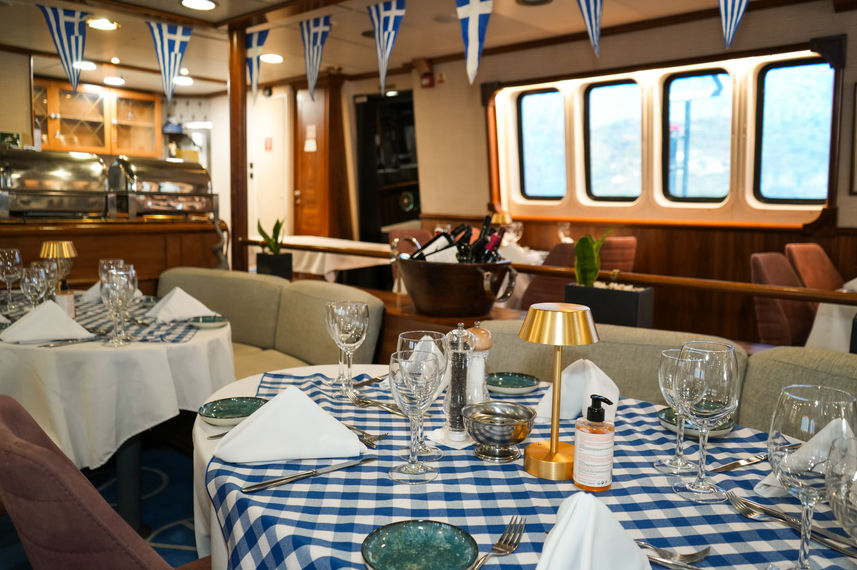 공용 공간에는 섬의 경치를 감상할 수 있는 천장부터 바닥까지 이어지는 창문이 있는 도서관 라운지가 포함되어 있습니다. 넓은 실내 식당에서는 승객들이 선상에서 제공되는 식사를 편안하게 즐길 수 있습니다. 상부 갑판에는 야외 바와 라운지 공간이 마련되어 있어 다른 여행자들과 어울리거나 저녁 시간에 휴식을 취하기에 좋습니다. 다른 야외 공간으로는 일광욕 갑판과 그늘진 후미 갑판이 있어 현지 햇살을 즐길 수 있습니다.