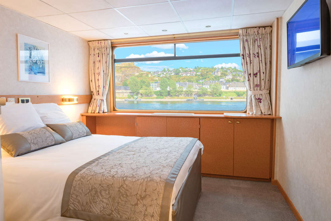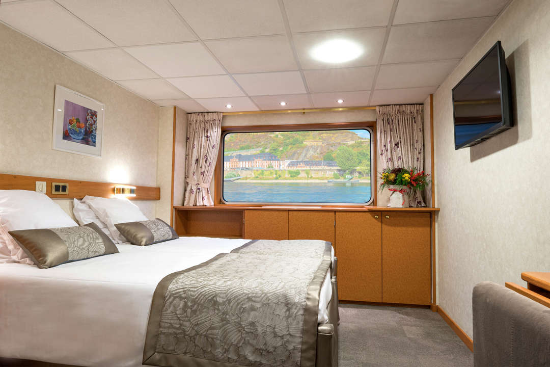 A spacious and comfortable cabin featuring two beds that can be arranged as a double or separated into twin beds. The cabin includes a private bathroom with a shower and bath amenities, along with a TV, safe, hairdryer, and radio. Located on the main deck, the high windows provide beautiful panoramic views of the surrounding landscapes.
