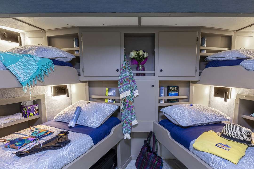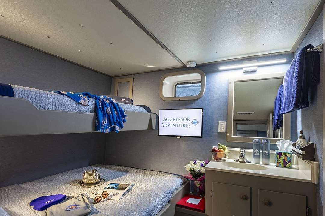Accommodating just 14 guests, the Belize Aggressor V offers an intimate liveaboard experience with only 6 staterooms. Every cabin is air-conditioned and features a private ensuite bathroom, fresh linens, towels, and practical storage space for soft luggage. Designed with divers in mind, the vessel combines cozy accommodations with convenient in-room comforts, creating a relaxed home base between dives.