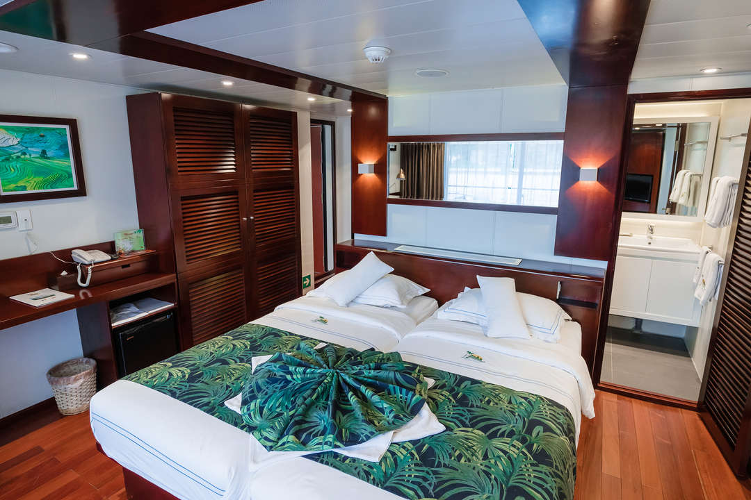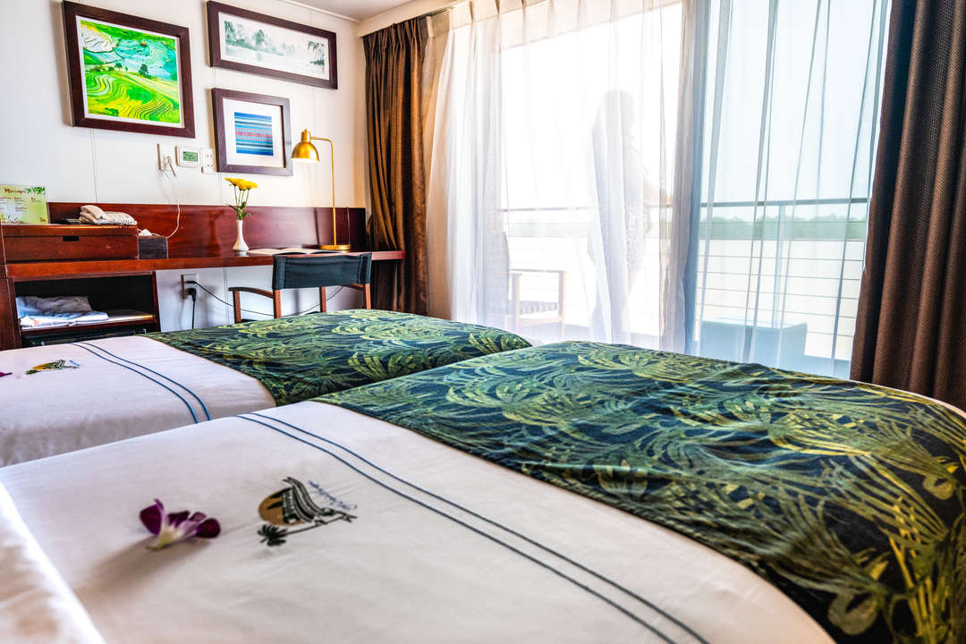 O Indochine II é um navio de cruzeiro em rio de 65 metros, recebendo 62 passageiros em 31 cabines distribuídas em três conveses. Cada cabine de 18 m² possui uma varanda privativa ou um terraço, ar condicionado, banheiro privativo, roupões, Tv e armazenamento amplo. Estilizado com painéis de madeira exótica, o navio elegantemente combina charme colonial com conforto moderno, garantindo uma experiência aconchegante e refinada a bordo.